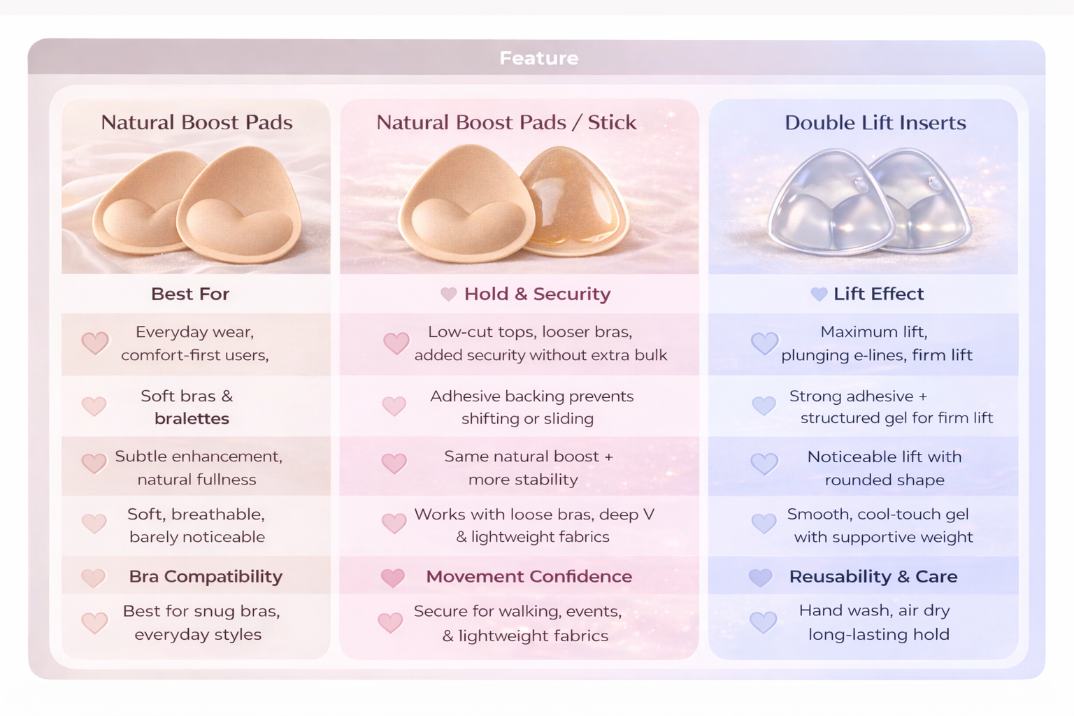 They’re designed to work with most bras, including soft bras, bralettes, low-cut styles, and lightweight fabrics.